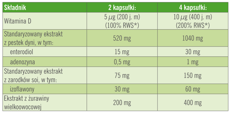 Zalecana dzienna porcja do spożycia – 2 kapsułki zawiera: witamina D – 5μg (100% RWS*), standaryzowany ekstrakt z pestek dyni – 520 mg, w tym enterodiol – 15 mg, adenozyna – 0,5 mg, standaryzowany ekstrakt z zarodków soi – 75 mg, w tym izoflawony sojowe – 30 mg, ekstrakt z żurawiny wielkoowocowej 200 mg.